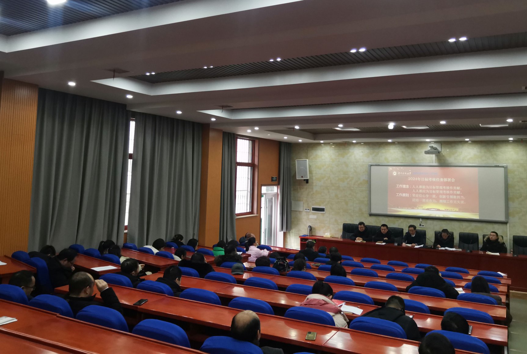 会上,进行了2024年目标管理考核任务领受。各系主任代表本系教职工领受目标管理考核任务。